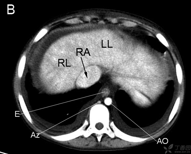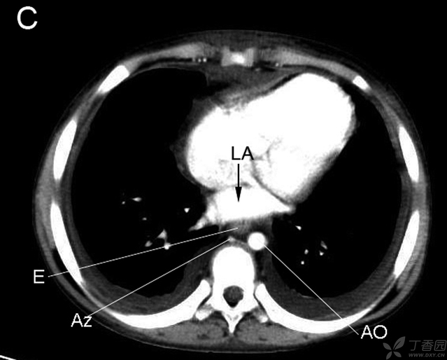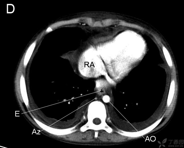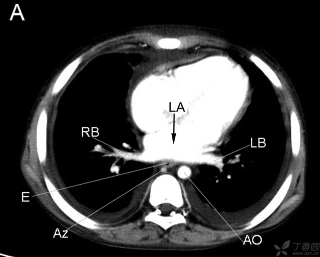 RB右支气管 LA左房 LB左支气管 E食管 AZ奇静脉 AO主动脉
