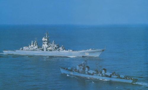 在这个专辑中,其中有一张照片是,从空中拍摄到的编号为103的中国导弹驱逐舰,正全速向一艘巨大的军舰猛冲而去,恰宛如圣经中所描绘的挑战巨人歌利亚的少年大卫!与人员依然都敞开在裸露的甲板上的103舰相比,这艘庞大的军舰耸立着巍峨的塔式桅杆,桅杆上鳞次栉比地密布着各种雷达天线,舰桥前则是满排着密密麻麻的垂直导弹发射井,高大的干舷上标着050的舷号,这便是当时苏联海军最先进的“伏龙芝”号重型核动力导弹巡洋舰。这种标准排水量24300吨基洛夫级舰是除了航空母舰与衣阿华级战列舰以外最大的水上作战舰艇,其出现曾经让世人所惊愕。
