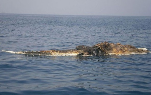 据国外媒体报道,日前伊朗海军在波斯湾海域航行时,发现一个诡异物体漂浮在海面上,随着船舰慢慢驶近,空气中弥漫的腐败恶臭更令人闻之作呕。其中一名船员把这只长约15米、板状脊椎外露的怪物拍了下来。